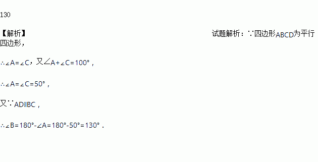 平行四边形ABCD中,∠A+∠C=100°,则∠B= ______度.