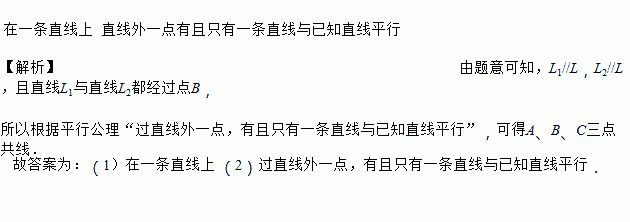 在一条直线上 直线外一点有且只有一条直线与已知直线平行 【解析】由题意可知,L1//L,L2//L,且直线L1与直线L2都经过点B, 所以根据平行公理“过直线外一点,有且只有一条直线与已知直线平行”,可得A、B、C三点共线. 故答案为:(1)在一条直线上 (2)过直线外一点,有且只有一条直线与已知直线平行.