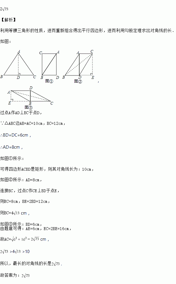 如图,在等腰三角形纸片ABC中,AB=AC=10,BC=12,将此等腰三角形纸片沿底边BC上的高AD剪成两个全等的三角形,用这两个三角形拼成一个平行四边形,则所拼出的所有平行四边形中最长的对角线的长是_____.