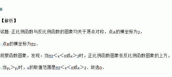 的图象相交于A,B两点,其中点B的横坐标为﹣2,当y1<y2时,x的取值范围是( )