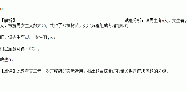 植树节这天有20名同学共种了52棵树苗,其中男生每人种树3棵,女生每人种树2棵.设男生有x人,女生有y人,根据题意,下列方程组正确的是( )