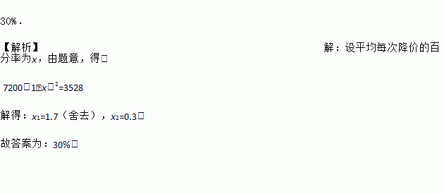 某种品牌的电脑,原价是7200元/台,经过连续两次降价后,现价是3528元/台,平均每次降价的百分率为______.