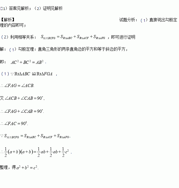(2)请利用直角梯形BCFG的面积证明勾股定理: