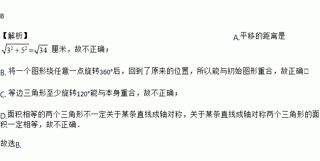B 【解析】A.平移的距离是厘米,故不正确; B. 将一个图形绕任意一点旋转360°后,回到了原来的位置,所以能与初始图形重合,故正确; C. 等边三角形至少旋转120°能与本身重合,故不正确; D.面积相等的两个三角形不一定关于某条直线成轴对称,关于某条直线成轴对称两个三角形的面积一定相等,故不正确. 故选B.