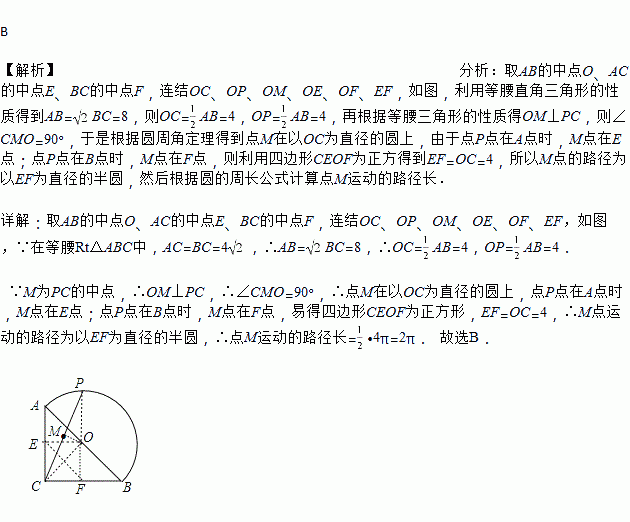 如图,在等腰Rt∆ABC中,,点P在以斜边AB为直径的半圆上,M为PC的中点.当点P沿半圆从点A运动至点B时,点M运动的路径长是( )