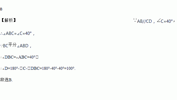 B 【解析】∵AB//CD,∠C=40°, ∴∠ABC=∠C=40°, ∵BC平分∠ABD, ∴∠DBC=∠ABC=40°, ∴∠D=180°-∠C-∠DBC=180°-40°-40°=100°. 故选B.
