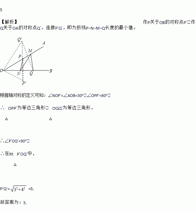 已知∠AOB=30°,点P、Q分别是边OA、OB上的定点,OP=3,OQ=4,点M、N是分别是边OA、OB上的动点,则折线P-N -M -Q长度的最小值是___________.