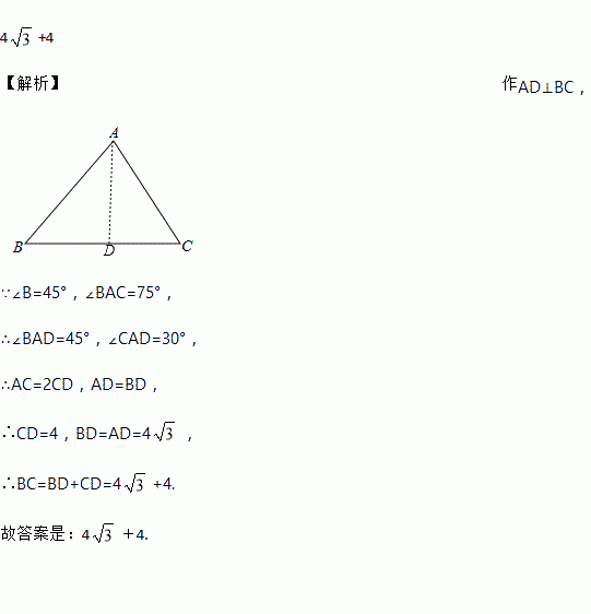 如图,已知△ABC中,∠B=45°,∠BAC=75°,AC=8,则BC=__________.