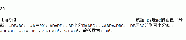如图,△ABC中,∠A=90°,DE是BC的垂直平分线,AD=DE,则∠C的度数是________°.