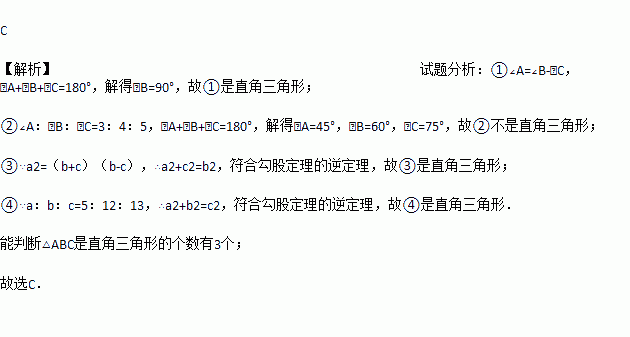 △ABC的三边长分别为a,b,c,下列条件:①∠A=∠B-∠C;②∠A:∠B:∠C=3:4:5;③a2=(b+c)(b-c);④a:b:c=5:12:13,其中能判断△ABC是直角三角形的个数有( )