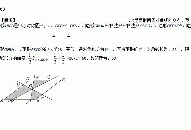 如图,已知菱形ABCD的边长是13,O是对角线的交点,过O点的三条直线将菱形分成阴影和空白部分.若菱形一条对角线长为10,则图中阴影部分的面积为______.