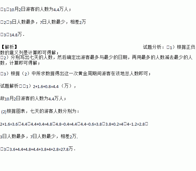 (1)10月2日游客的人数为4.4万人; (2)3日人数最多,7日人数最少,相差2万 (3)14.8万. 【解析】试题分析:(1)根据正负数的意义列是计算即可得解; (2)分别写出七天的人数,然后确定出游客最多与最少的日期,再用最多的人数减去最少的人数,计算即可得解; (3)根据(2)中所求数据得出这一次黄金周期间游客在该地总人数即可; 试题解析:(1)2+1.6+0....