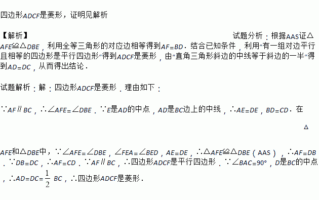 如图,在△ABC中,∠BAC=90°,AD是中线,E是AD的中点,过点A作AF∥BC交BE的延长线于F,连接CF.试判断四边形ADCF的形状,并证明你的结论.