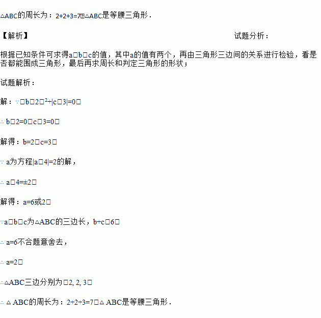 △ABC的周长为:2+2+3=7,△ABC是等腰三角形. 【解析】试题分析: 根据已知条件可求得a、b、c的值,其中a的值有两个,再由三角形三边间的关系进行检验,看是否都能围成三角形,最后再求周长和判定三角形的形状; 试题解析: 【解析】 ∵(b﹣2)2+|c﹣3|=0, ∴ b﹣2=0,c﹣3=0, 解得:b=2,c=3, ∵ a为方程|a﹣4|=2的...