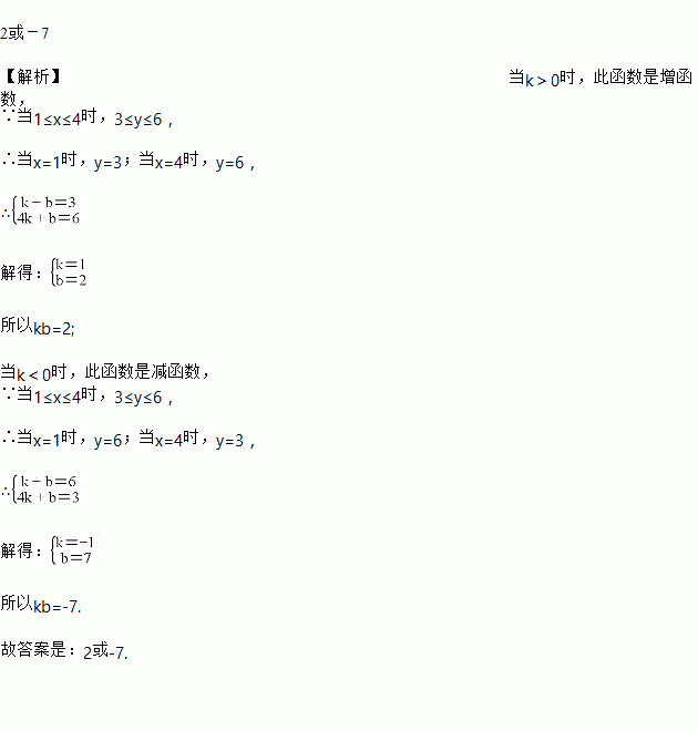 一次函数y=kx+b,当1≤x≤4时,3≤y≤6,则k·b的值是____________.