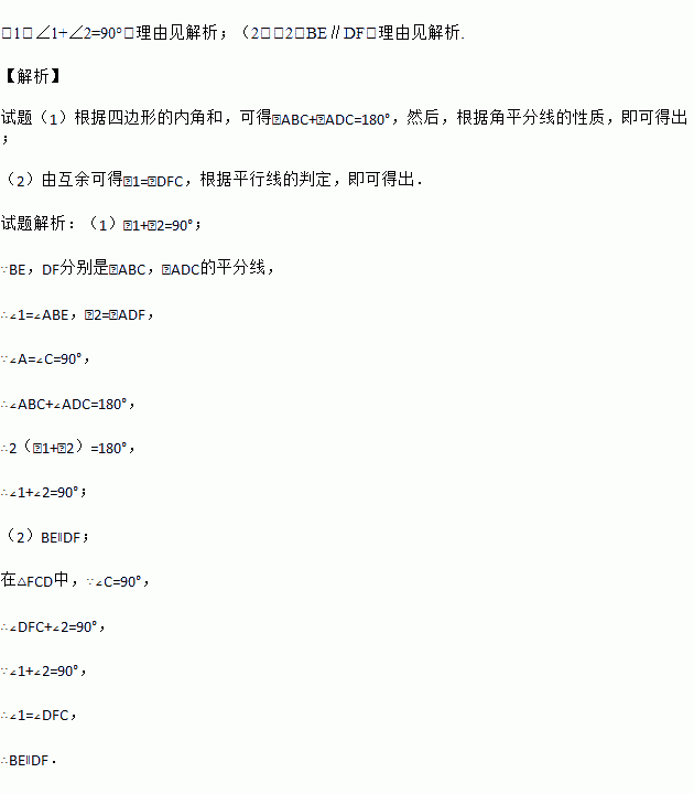 如图,四边形ABCD中,∠A=∠C=90°,BE,DF分别是∠ABC,∠ADC的平分线.