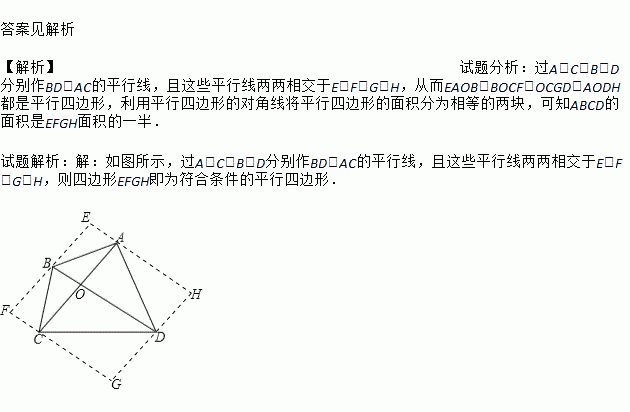 如图,为公园的一块草坪,其四角上各有一棵树,现园林工人想使这个草坪的面积扩大一倍,又要四棵树不动,并使扩大后的草坪为平行四边形,试问这个想法能否实现,若能请你设计出草图,否则说明理由.