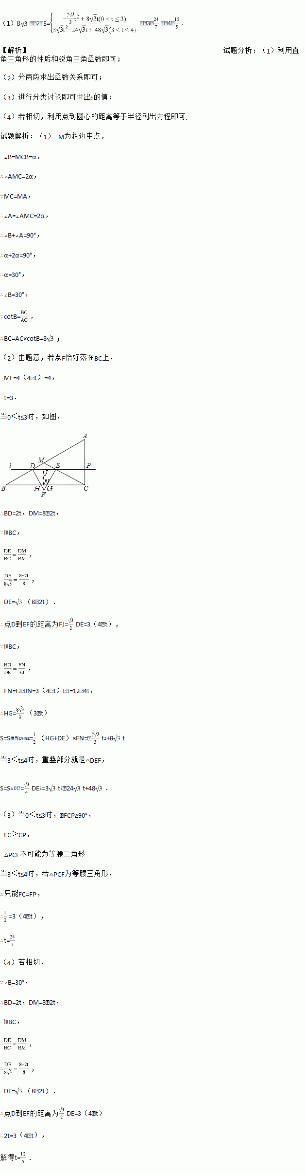 如图,Rt△ABC中,M为斜边AB上一点,且MB=MC=AC=8cm,平行于BC的直线l从BC的位置出发以每秒1cm的速度向上平移,运动到经过点M时停止.直线l分别交线段MB、MC、AC于点D、E、P,以DE为边向下作等边△DEF,设△DEF与△MBC重叠部分的面积为S(cm2),直线l的运动时间为t(秒).