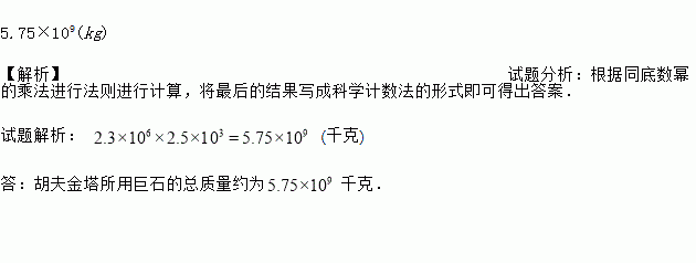 5.75×109(kg) 【解析】试题分析:根据同底数幂的乘法进行法则进行计算,将最后的结果写成科学计数法的形式即可得出答案. 试题解析: (千克) 答:胡夫金塔所用巨石的总质量约为千克.