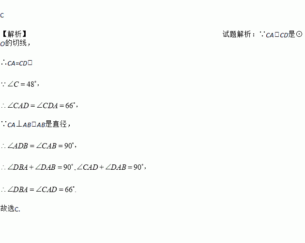 如图,AB是⊙O的直径,点C为⊙O外一点,CA、CD是⊙O的切线,A、D为切点,连接BD、AD.若∠ACD=48º,则∠DBA的大小是:
