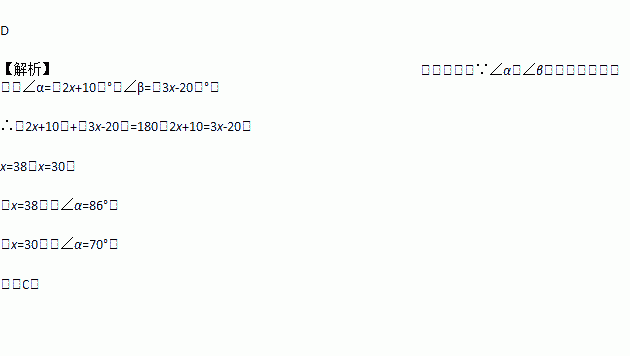 A. 70° B. 86° C. 70°或86° D. 30°或38°