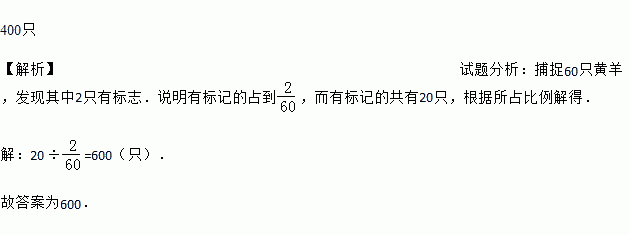 某地区为估计该地区黄羊的只数,先捕捉20只黄羊给它们分别作上标志,然后放回,待有标志的黄羊完全混合于黄羊群后,第二次捕捉40只黄羊,发现其中两只有标志.从而估计该地区有黄羊_____.