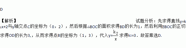 如图,在平面直角坐标系系中,直线y=k1x+2与x轴交于点A,与y轴交于点C,与反比例函数y=