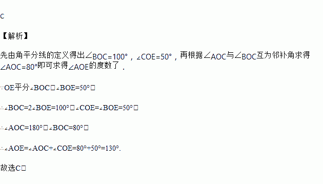 如图,直线AB、CD交于O,OE是∠BOC的平分线且∠BOE=50度,那么∠AOE=( )度.