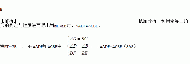 B 【解析】试题分析:利用全等三角形的判定与性质进而得出当∠D=∠B时,△ADF≌△CBE. 当∠D=∠B时, 在△ADF和△CBE中 ∵, ∴△ADF≌△CBE(SAS)