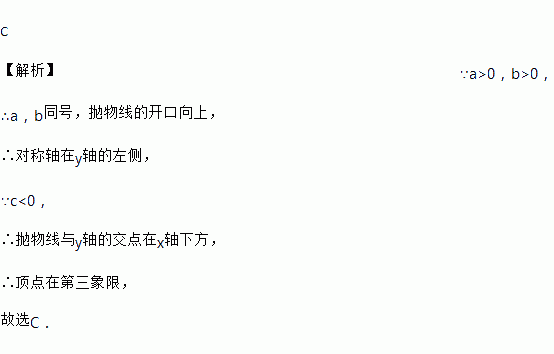 C 【解析】∵a>0,b>0, ∴a,b同号,抛物线的开口向上, ∴对称轴在y轴的左侧, ∵c<0, ∴抛物线与y轴的交点在x轴下方, ∴顶点在第三象限, 故选C.