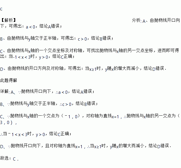 A. a>0 B. c<0 C. 当﹣1<x<3时,y>0 D. 当x≥1时,y随x的增大而增大