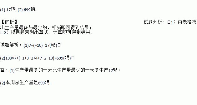 (1) 17辆; (2) 699辆. 【解析】试题分析:(1)由表格找出生产量最多与最少的,相减即可得到结果; (2)根据题意列出算式,计算即可得到结果. 试题解析:(1)7?(?10)=17(辆); (2)100×7+(?1+3?2+4+7?2?10)=699(辆), 答:(1)生产量最多的一天比生产量最少的一天多生产17辆; (2)本周总生产量是699辆. ...