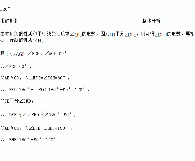 已知:如图AB∥CD,EF交AB于G,交CD于F,FH平分∠EFD,交AB于H ,∠AGE=600,求:∠BHF的度数.