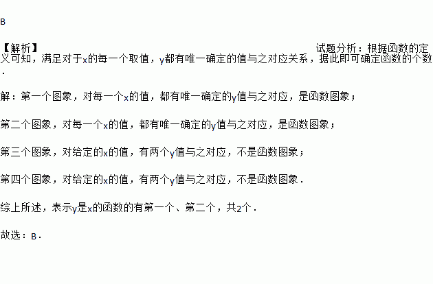 B 【解析】试题分析:根据函数的定义可知,满足对于x的每一个取值,y都有唯一确定的值与之对应关系,据此即可确定函数的个数. 【解析】 第一个图象,对每一个x的值,都有唯一确定的y值与之对应,是函数图象; 第二个图象,对每一个x的值,都有唯一确定的y值与之对应,是函数图象; 第三个图象,对给定的x的值,有两个y值与之对应,不是函数图象; 第四个图象,对给定的x的值,有...