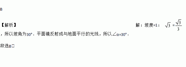 如图,一束光线照在坡度为1: 的斜坡上,斜坡上的平面镜反射成与地面平行的光线,则这束光线与坡面的夹角是( ).