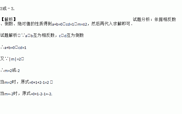小明参加“趣味数学”选修课,课上老师给了一个问题,小明看了很为难,你能帮他一下吗?已知a,b互为相反数,c,d互为倒数,|m|=3,则+1+m﹣cd的值为多少?
