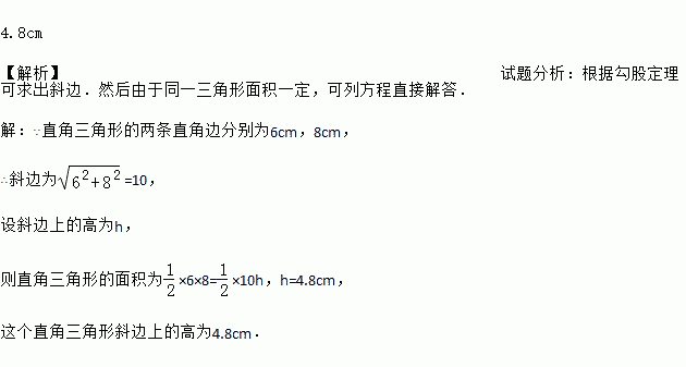已知一个直角三角形的两条直角边分别为6cm、8cm,那么这个直角三角形斜边上的高为_______.