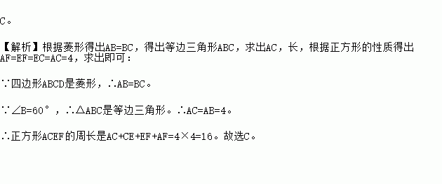 如图,菱形ABCD中,,AB=4,则以AC为边长的正方形ACEF的周长为【 】