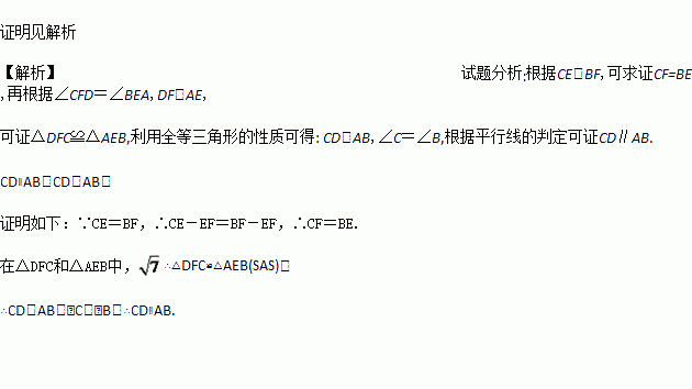 如图,点C,F,E,B在一条直线上,∠CFD=∠BEA,CE=BF,DF=AE,写出CD与AB之间的关系,并证明你的结论.
