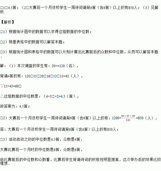 (1)活动启动之初学生“一周诗词诵背数量”的中位数为 ;