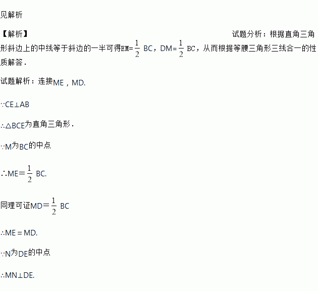 如图,在△ABC中,BD⊥AC于D,CE⊥AB于E,M,N分别是BC,DE的中点.求证:MN⊥DE(提示:连接ME,MD).