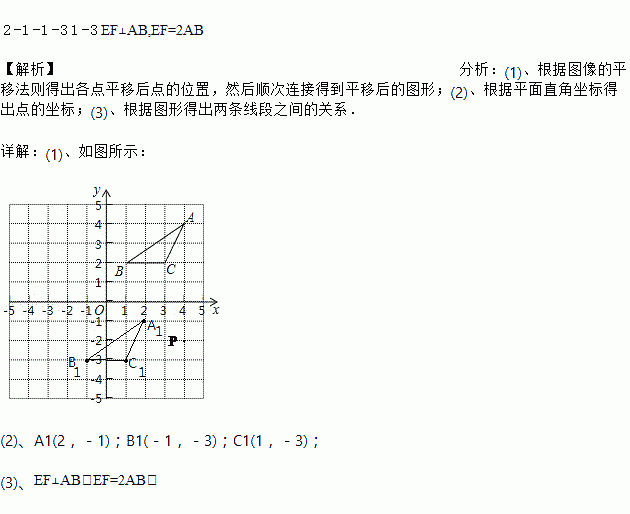 (1)将△ABC向下平移5个单位长,再向左平移2个单位长,画出两次平移后得到的△A1B1C1;