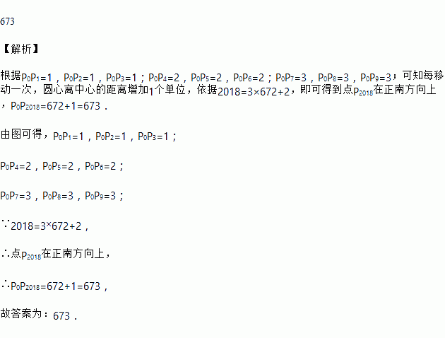 如图:图象①②③均是以P0为圆心,1个单位长度为半径的扇形,将图形①②③分别沿东北,正南,西北方向同时平移,每次移动一个单位长度,第一次移动后图形①②③的圆心依次为P1P2P3,第二次移动后图形①②③的圆心依次为P4P5P6…,依此规律,P0P2018=_____个单位长度.
