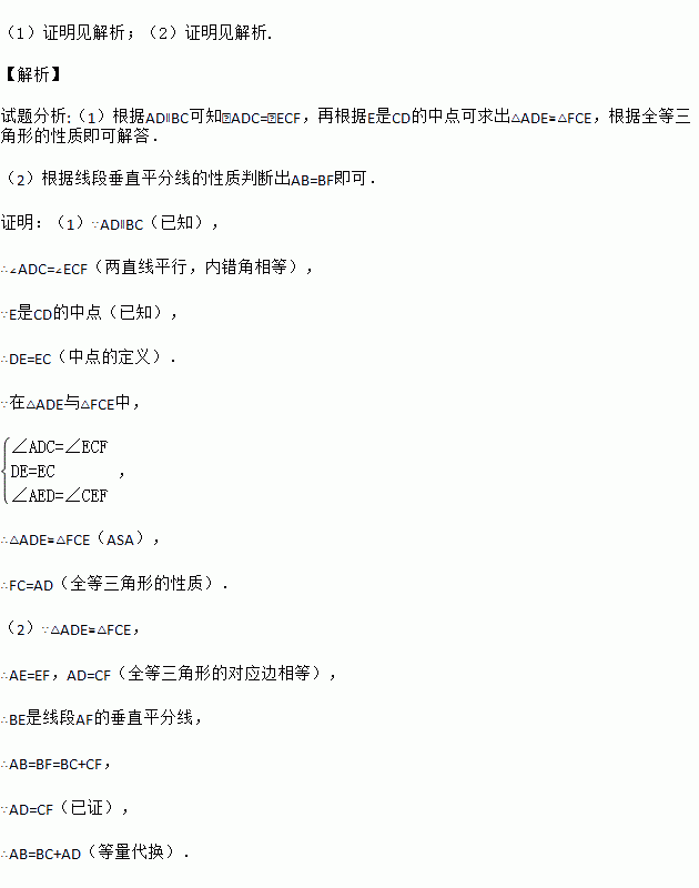 如图所示,在四边形ABCD中,AD∥BC,E为CD的中点,连接AE、BE,BE⊥AE,延长AE交BC的延长线于点F.求证:(1)FC=AD;(2)AB=BC+AD.