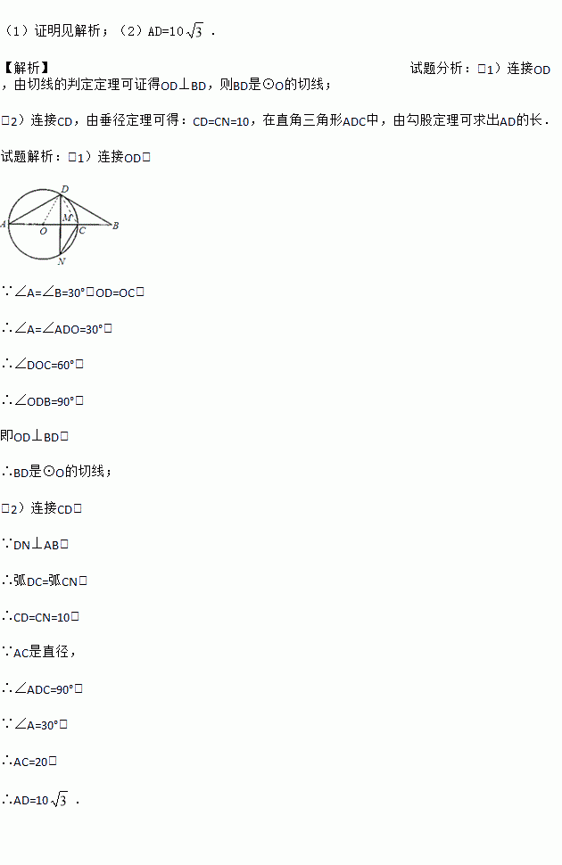 (2)若点N在⊙O上,且DN⊥AB,垂足为M,NC=10,求AD的长.