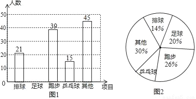 (3)在图2中,“乒乓球”所对应扇形的圆心角的度数为 ;