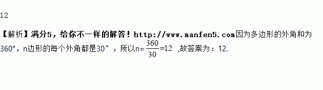 如果一个n边形的每个外角都是30°,那么n的值为_________。