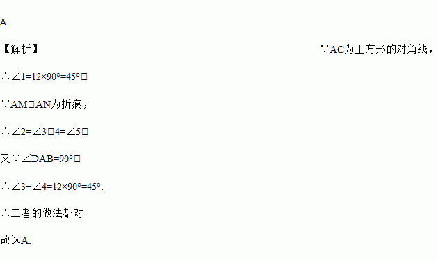 A 【解析】∵AC为正方形的对角线, ∴∠1=12×90°=45°; ∵AM、AN为折痕, ∴∠2=∠3,4=∠5, 又∵∠DAB=90°, ∴∠3+∠4=12×90°=45°. ∴二者的做法都对。 故选A.