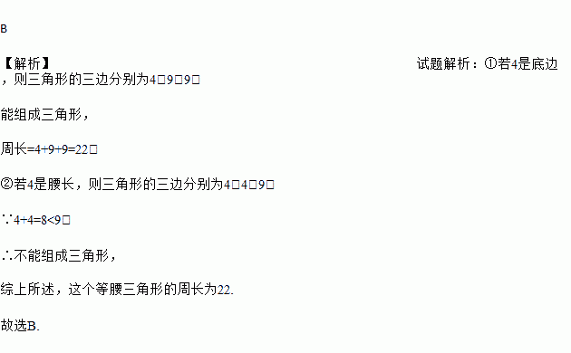 已知等腰三角形的其中两边长分别为4,9,则这个等腰三角形的周长为( )