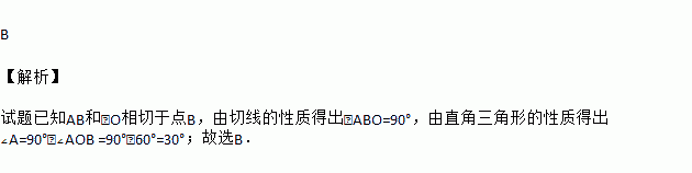 如图,AB与⊙O相切于点B,∠AOB=60°,则∠A的度数为( )